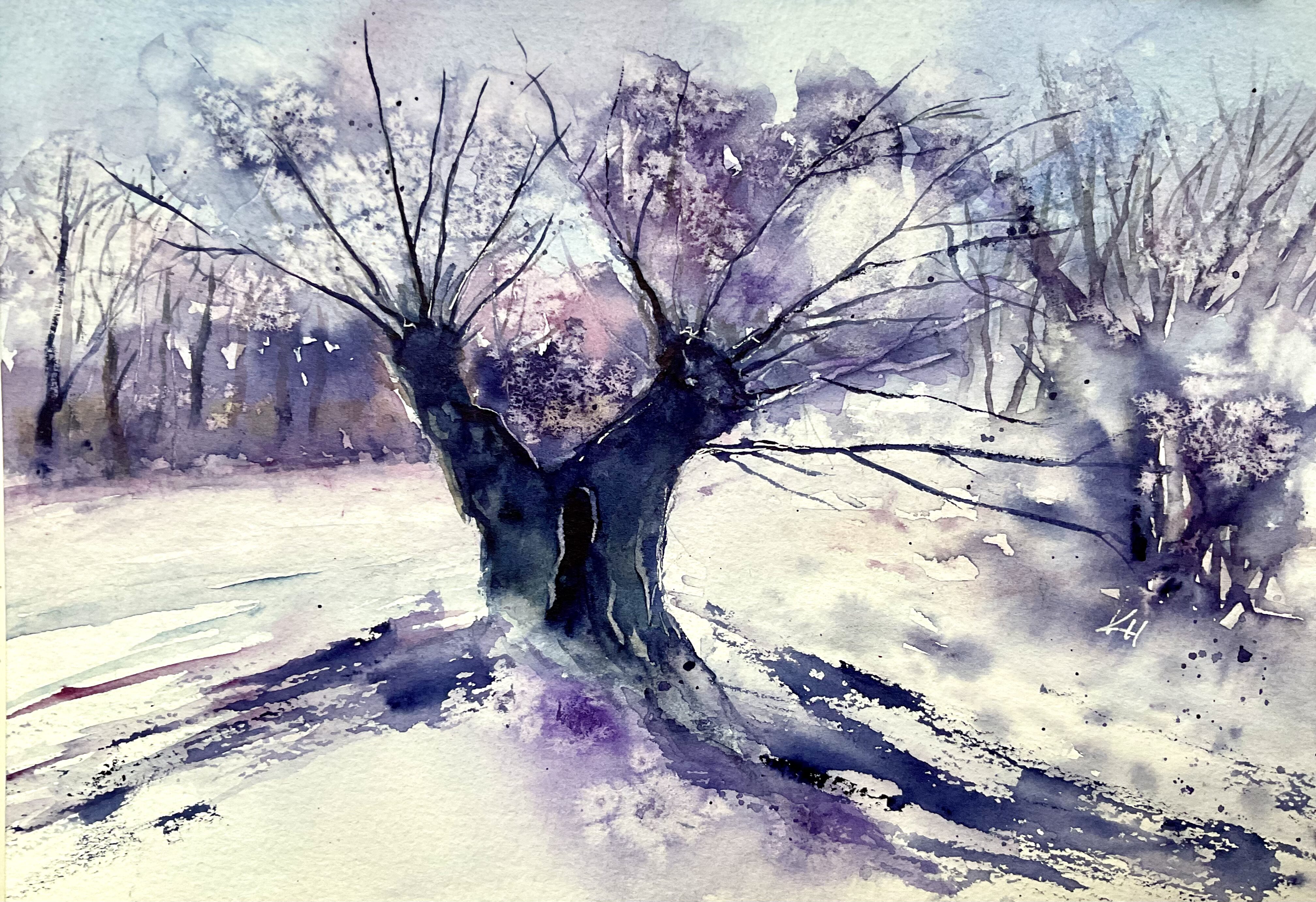 Unweit von meinem Atelier gibt es einen malerischen Ort, der mit alten Kopfweiden gesäumt ist. Wenn man diesen Weg entlang geht, spaziert man durch ein Bilderbuch. Man sagt, es gibt diese Orte mit einer speziellen magischen Aura. Genau dies meine ich bei diesem Weg mit den alten geheimnissvollen Kopfweiden. Man spürt förmlich diese Kraft, diese wohltuende Atmosphäre und so ist es nicht verwunderluch, dass ich diesen Ort immer wieder aufsuche und in meine Bilder fließen lasse. Diesmal entstand das Bild mit der Kopfweide und dem noch sichtbaren Vollmond.